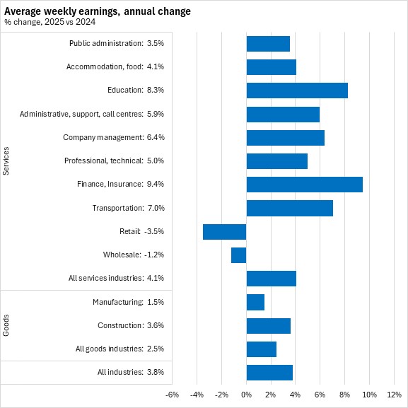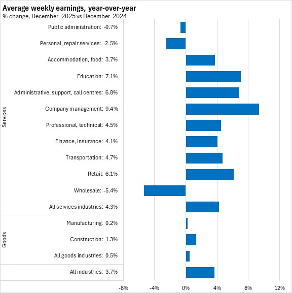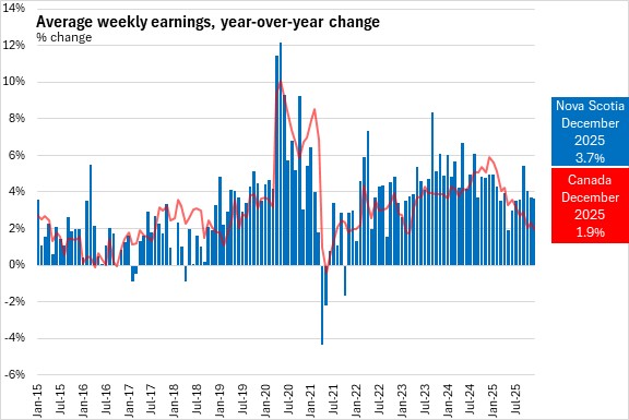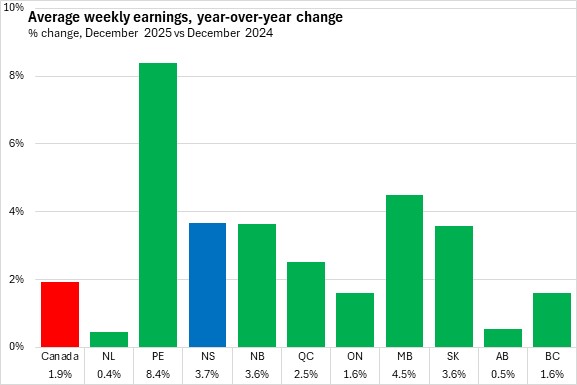 Average weekly wages grew by 3.7% in Nova Scotia from December 2024 to December 2025. This was stronger than the national pace of 1.9%.