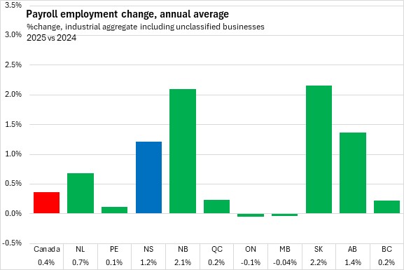 In 2025, Nova Scotia's payroll employment increased 1.2%. This was faster than the national average of 0.4% as all provinces reported growth except Manitoba and Ontario. The fastest growth was reported in New Brunswick and Saskatchewan.