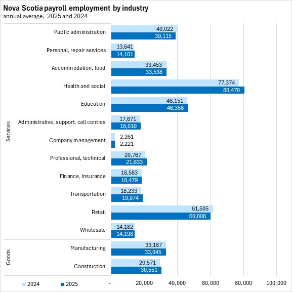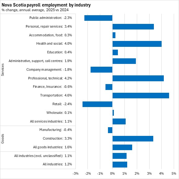 Transportation, professional/technical, and health care/social assistance services reported the fastest growth in payroll employment in 2025 in Nova Scotia. The fastest declines were reported in retail trade and public administration.