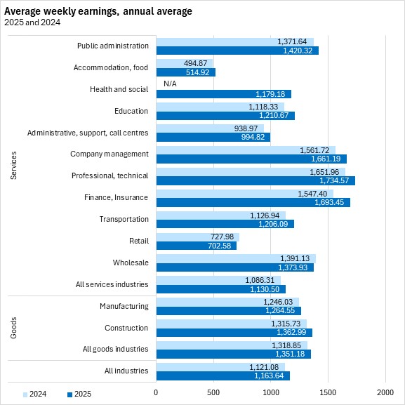 Nova Scotia's average weekly earnings were highest in professional/technical services, finance/insurance, company management, and public administration in 2025 (among industries with available data for this period). Average weekly earnings among payroll employees grew the fastest for finance/insurance, education, and transportation. Retail and wholesale trade reported lower average weekly earnings.