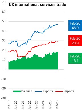 The UK services trade surplus was unchanged at £18.1 billion. Exports of services increased 0.3% (£0.1 billion) to £46.9 billion and imports of services increased 0.6% (£0.2 billion) to £28.9 billion.
