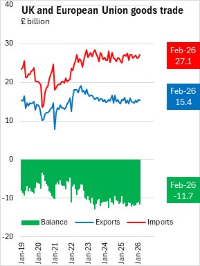 The UK goods and services trade balance deficit narrowed by £4.1 billion from February 2025 to £0.7 billion in February 2026. The goods trade deficit narrowed by £1.2 billion and the services trade surplus widened by £2.9 billion.
