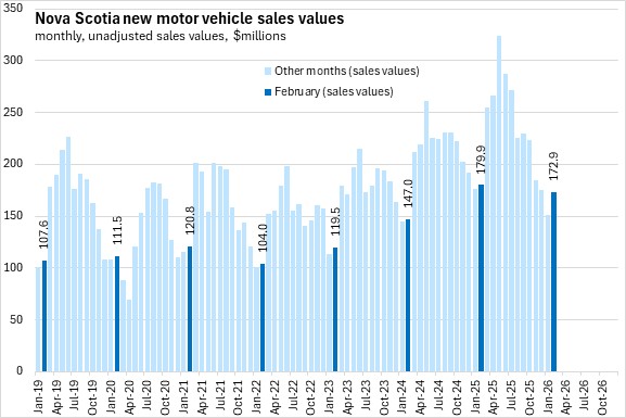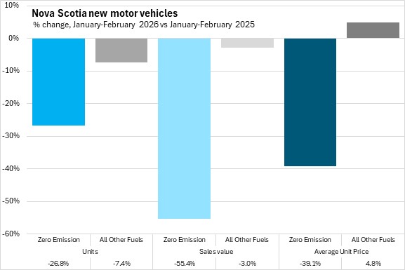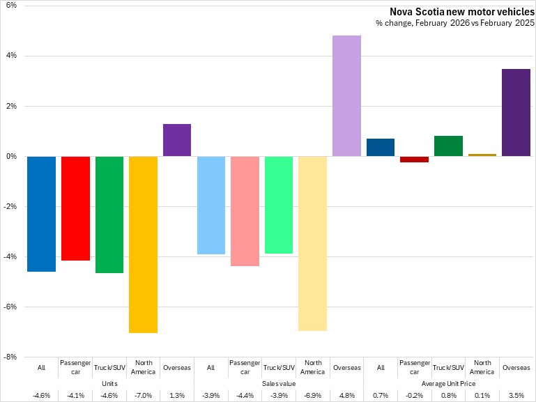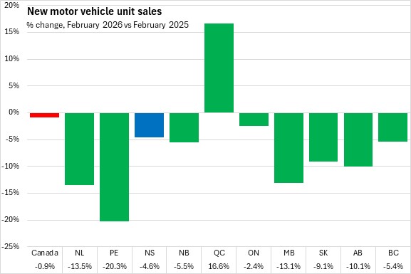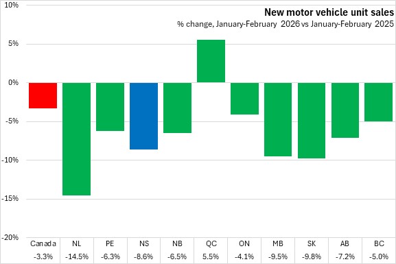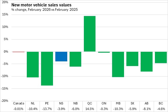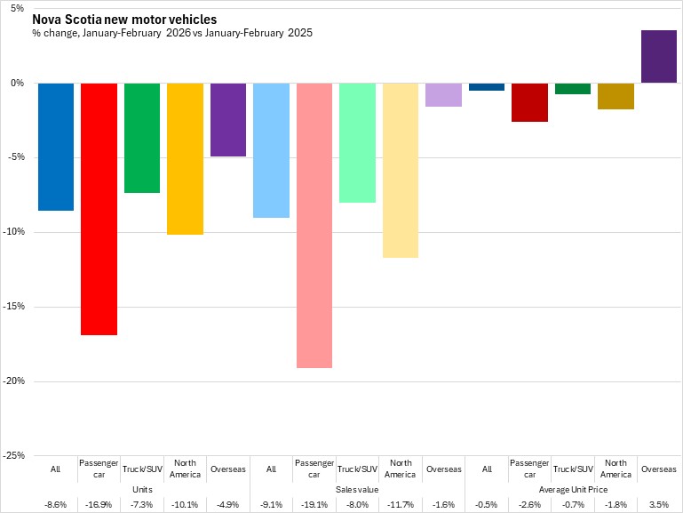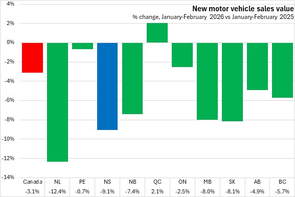 The sales values of new vehicles decreased 9.1% in Nova Scotia in January-February 2026, the second fastest decline among provinces behind Newfoundland and Labrador. National sales values were down 3.1% with declines in all provinces except Québec.
