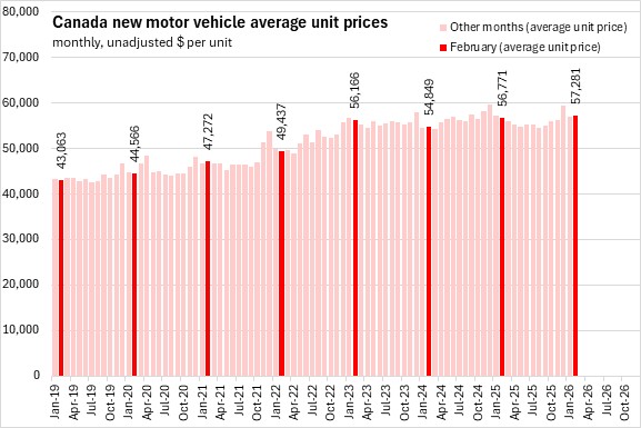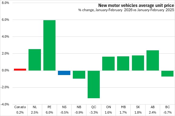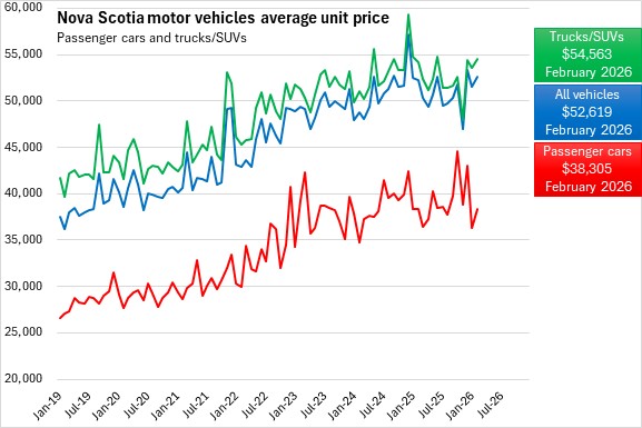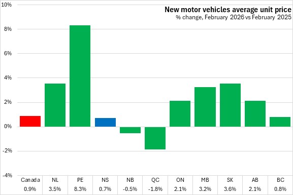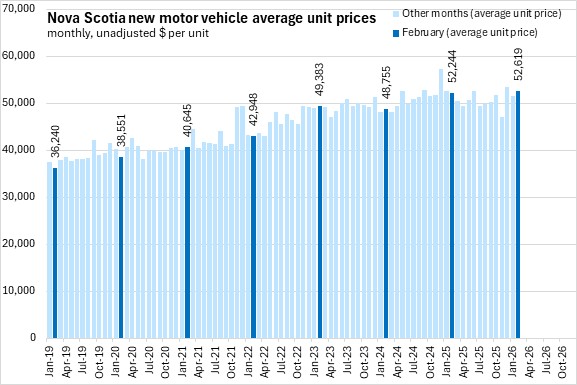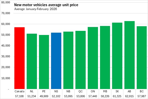 The average price of a new vehicle in February 2026 was $52,619 in Nova Scotia - third lowest among provinces ahead of Prince Edward Island and Newfoundland and Labrador. Nationally, the average price of a new vehicle was $57,281, with the highest value in Alberta.