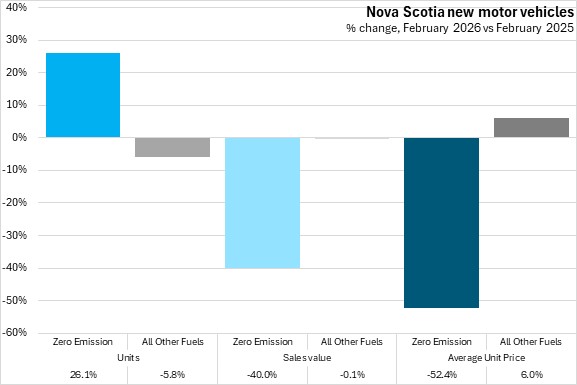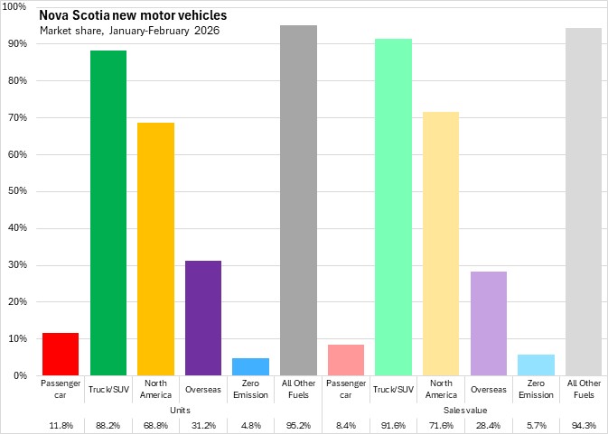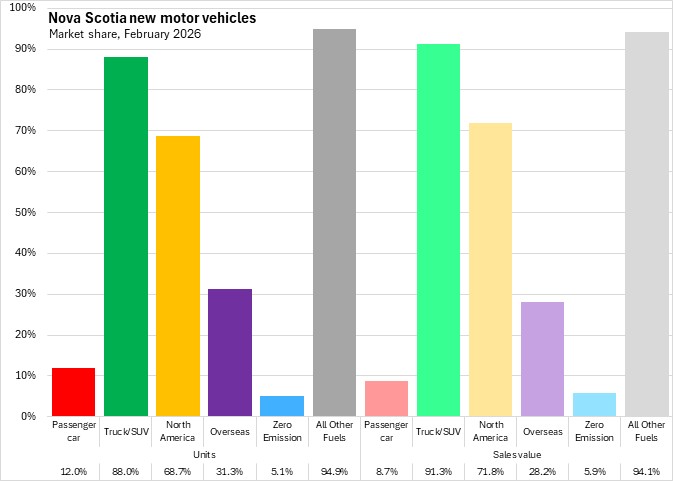 In February 2026, trucks/SUVs accounted for 88.0% of unit sales and 91.3% of sales values. North American manufacturers accounted for 68.7% of Nova Scotia's unit sales and 71.8.% of sales values in February 2026. Zero emission vehicles made up 5.1% of unit sales, and 5.9% of sales values, while all other fuel types accounted for 94.9% of unit sales and 94.1% of sales values.