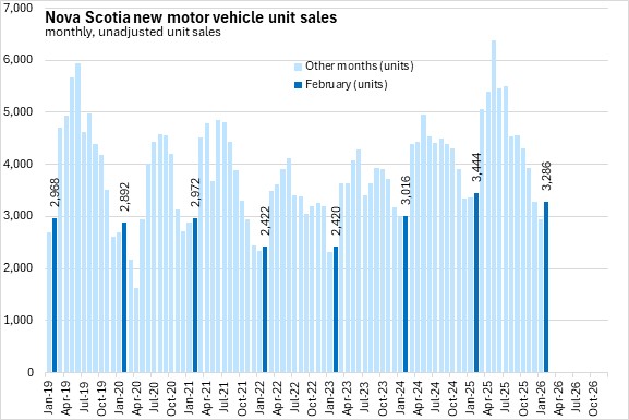 Nova Scotia's unit sales of 3,286 in February 2026 was slightly lower than the same month in 2025, but above the same month in previous years.