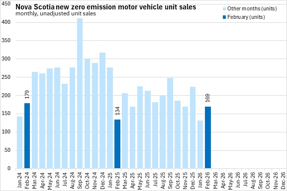 Average prices for zero-emission vehicles rose sharply in late 2024 and subsequently fell below previous levels by July 2025. Average price for zero-emission vehicles remain below late 2024 and early 2025 levels. The low overall number of zero emission vehicles sold in Nova Scotia (169 in February 2026) can lead to volatility in prices.