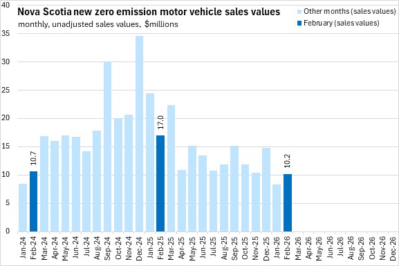 Zero-emission vehicles are currently a small share of the new motor vehicle market in Nova Scotia. Due to the small number of vehicles sold, there can be volatility in the year-over-year or year-to-date comparisons for unit sales, sales value and average prices. Nova Scotia zero-emission vehicle sales values were down compared to February 2025 and 2024, while unit sales were down compared to February 2024 but up compared to February 2025.