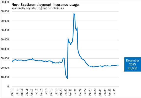 In December 2025, there were 23,060 Nova Scotians in receipt of regular employment insurance benefits (seasonally adjusted). Nova Scotia's seasonally adjusted regular employment insurance usage increased by 40 (+0.2%) from revised November results to December.