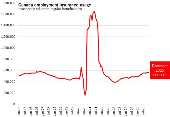 There were 569,110 Canadians that received regular employment insurance benefits in December 2025 (seasonally adjusted), an increase of 2,470 (+0.4%) from the revised November 2025 value.