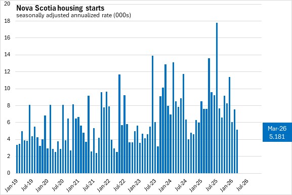 Nova Scotia’s housing starts (seasonally adjusted annualized rate) totalled 5,181 units in March 2026. This was a 31.6% decline from the previous month's revised value of 7,572 starts.