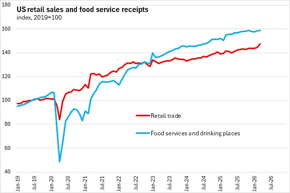 US retail sales increased 1.9% from the previous month. Food service and drinking places receipts rose 0.1%.