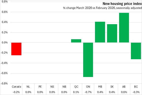 New housing prices in Nova Scotia were unchanged from February to March 2026. Nationally the price of new houses was down 0.2%, with Québec and the prairie provinces posting growth and the four Atlantic provinces reporting no change. The fastest monthly gain was reported in Alberta. Ontario and Briti...