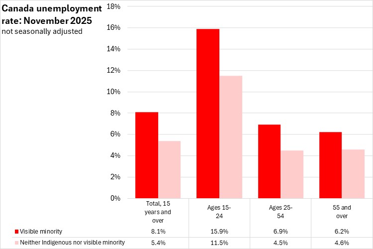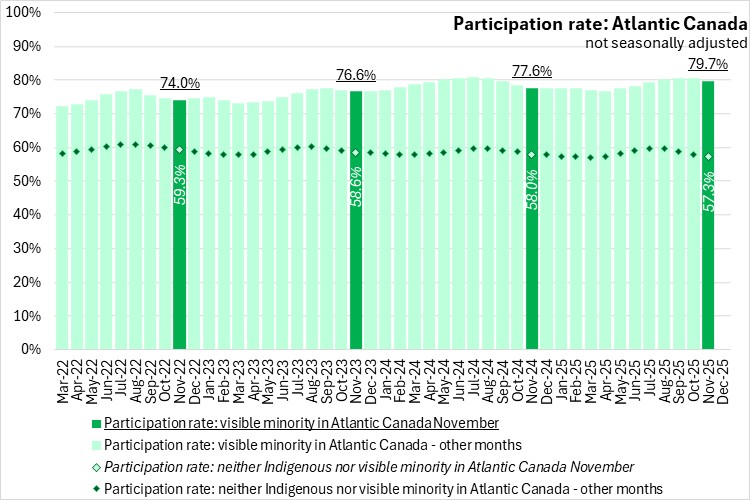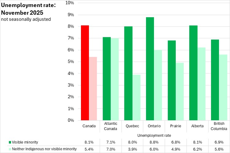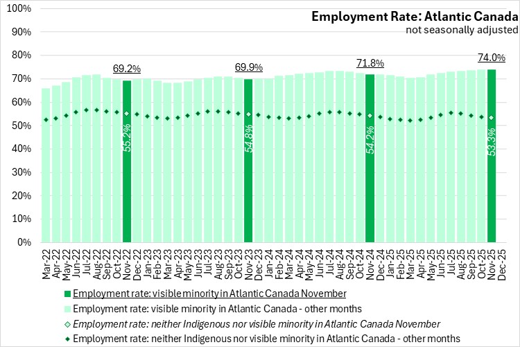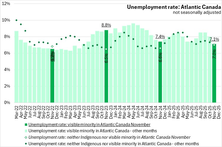 In November 2025, the unemployment rate for the visible minority population was higher compared to the population that was neither Indigenous nor in a visible minority population in Atlantic Canada for the fith consecutive month.