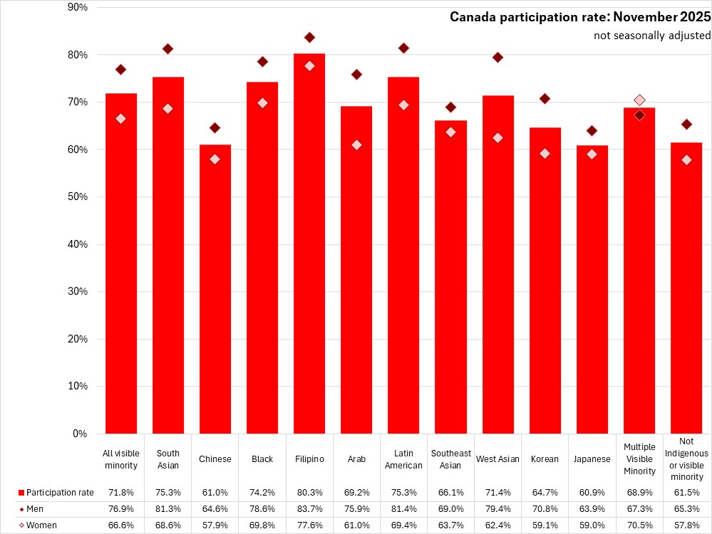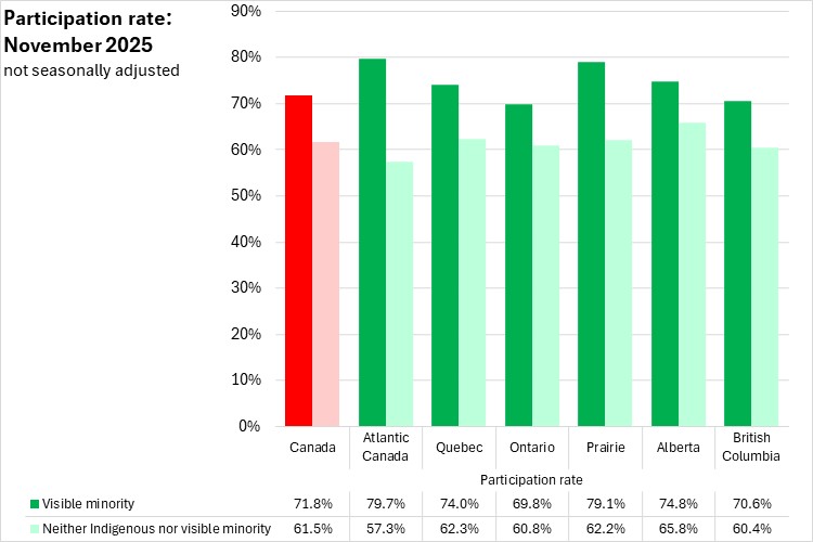 National participation rates were higher for those who identify with a visible minority population (71.8%) than for those that did not identify as Indigenous or in a visible minority population (61.5%). Participation rates of those who identify with a visible minority population were higher in all regions in November 2025. In Atlantic Canada, those who identify with a visible minority population reported a 79.7% participation rate, compared to a 57.3% participation rate for those that do not identify as Indigenous or in a visible minority population, the largest gap among regions.
