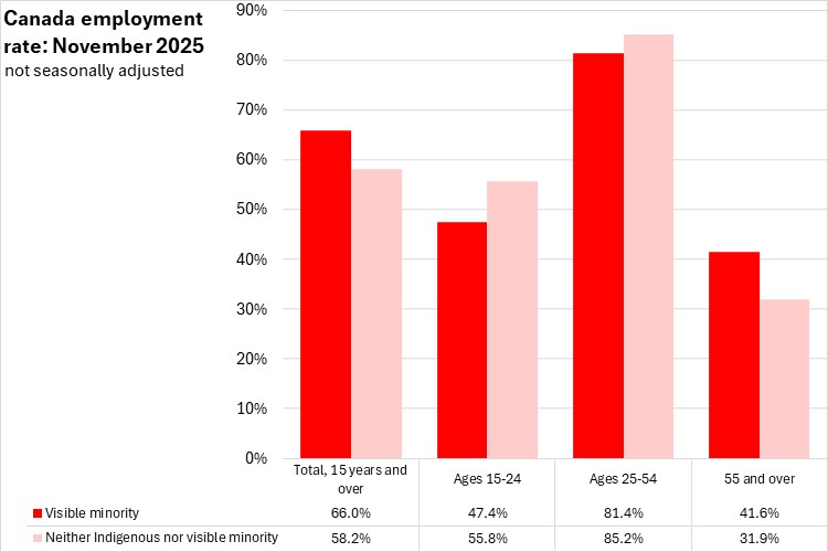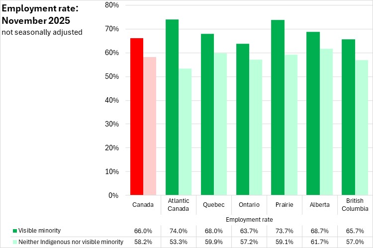 Nationally, employment rates were higher for those who identified with visible minority populations (66.0%) than for those who did not identify as Indigenous or in a visible minority population (58.2%). Employment rates were higher for those who identify with visible minority populations in every region when compared against those who do not identify as Indigenous or in a visible minority population in November 2025. The gap between the employment rates for those who identified with visible minority populations (74.0%) and those who did not (53.3%) was highest in Atlantic Canada.