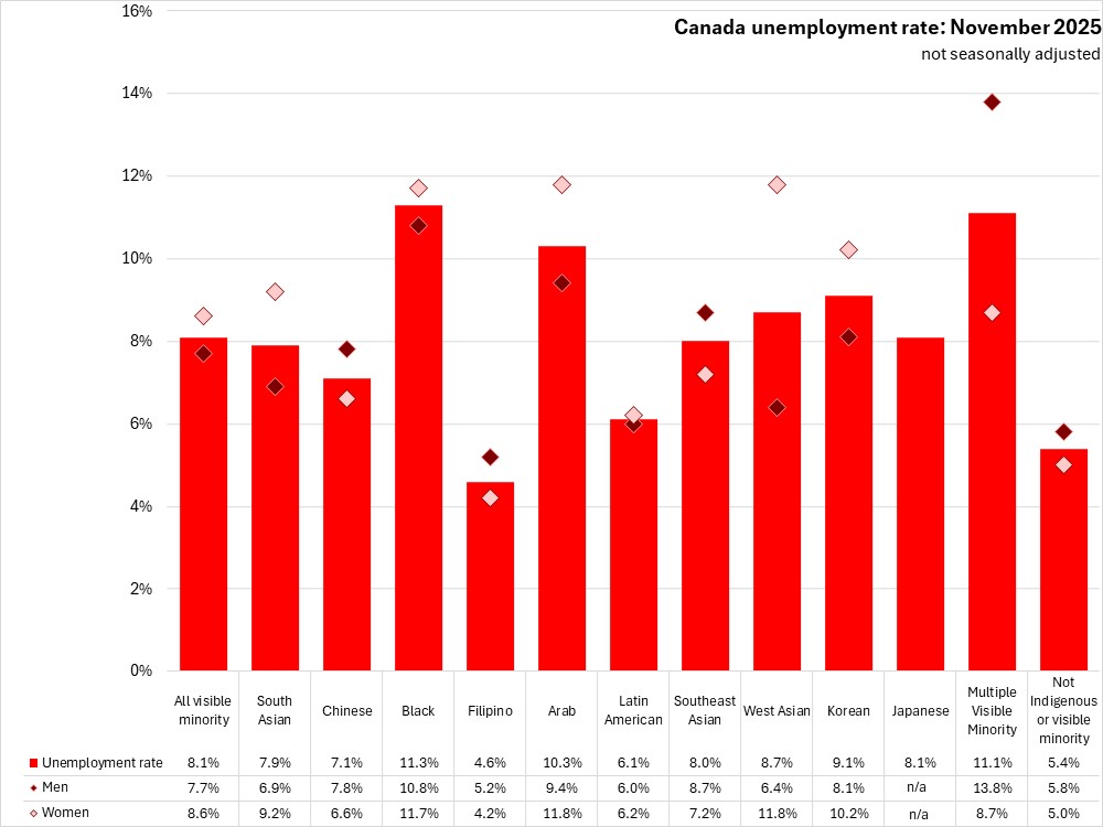 In November 2025, the unemployment rates of males in all visible minority populations were lower (7.7%) than for females in visible minority populations (8.6%), which was not the case for populations that did not identify as Indigenous or visible minorities. Among specific populations, female unemployment rates were lower than for males among Chinese, Filipino and South East Asian, as well as for those that identified with multiple visible minority populations and those not indigenous or visible minority.