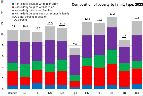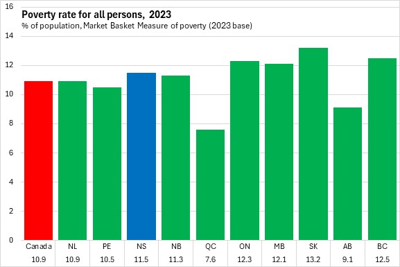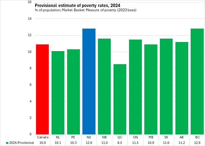 Provisional estimates for 2024 indicate that the poverty rate was 12.5% in Nova Scotia - tied with British Columbia for highest among provinces. The provisional national poverty rate was 10.9% in 2024 with the lowest rate in Québec. Note that these provisional rates cannot be compared with prior estimates.