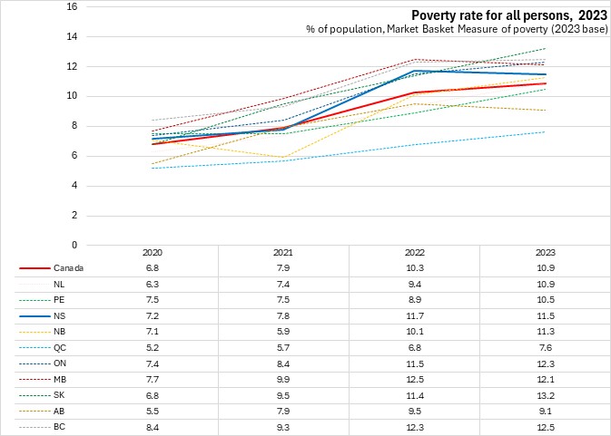 Note that there were significant government income supports during the COVID-19 pandemic which drove a large decline in the poverty rates for 2020 and 2021. These supports were largely withdrawn by 2022 while there was a significant acceleration in inflation that persisted into 2023.