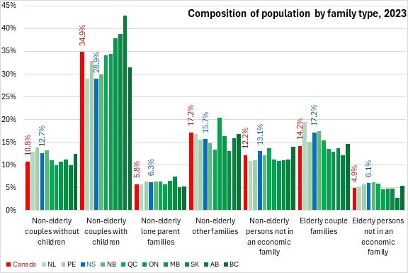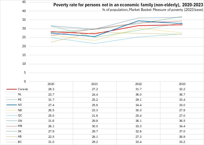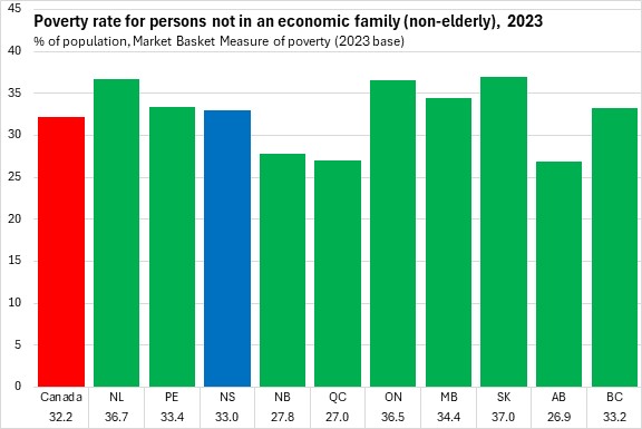 Persons not in economic families report the highest poverty rates. In 2023, 33.0% of Nova Scotians who were not in an economic family lived in poverty (using the 2023 base for the market basket). This is above the national average fo 32.2%. Persons not in economic families reported the highest poverty rates in Saskatchewan, Newfoundland and Labrador and Ontario. The lowest poverty rates among non-elderly persons not in an economic family were in Alberta and Québec.