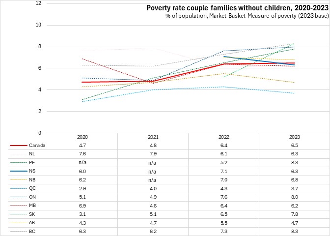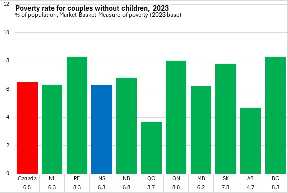The poverty rate for couple economic families without children was 6.3% in Nova Scotia in 2023, using the 2023-base for the market basket. This was below the national average of 6.5% (highest: Prince Edward Island and British Columbia, lowest: Québec).