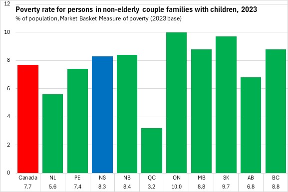 In Nova Scotia, 8.3% of couple families with children were below the MBM poverty line (2023 base) in 2023. The national poverty rate for couple families with children was 7.7% (highest: Ontario and Saskatchewan, lowest: Québec).