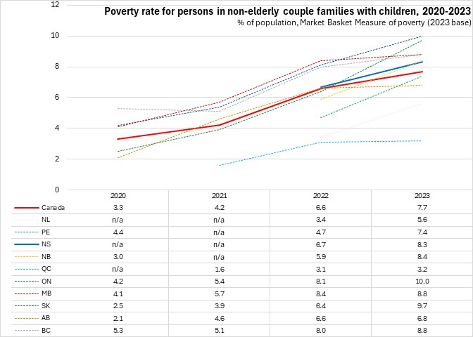 Nova Scotia's poverty rate for couple families with children was down from 2022 to 2023. Five provinces reported rising poverty rates for couple families with children.