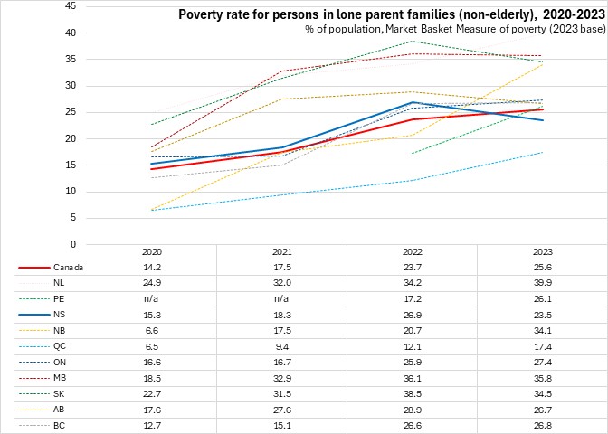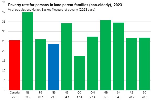 Lone parent families have historically had higher poverty rates than for couple economic families. In Nova Scotia, 23.5% of those in lone parent families lived in poverty, the second lowest poverty rate for lone parents after Québec. The national poverty rate for lone parent families was 25.6% for these families (using the 2023 base for the market basket). Lone parent poverty was highest in Newfoundland and Labrador.