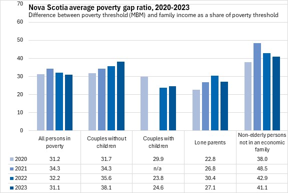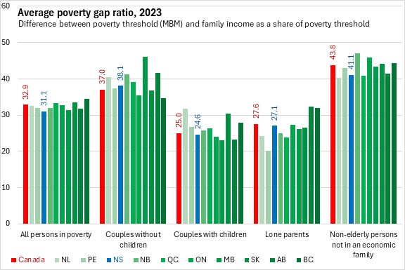 The average poverty gap reports the difference between the MBM threshold and family income, stated as a percentage of the threshold. For all Nova Scotians living in poverty in 2023, the gap was 31.1% of the (2023 base) MBM threshold, which was the smallest gap among provinces. Outside of couples without children Nova Scotia's poverty gap was smaller than the national average for each major family structure. Nova Scotia's poverty gap ratio was smallest for couples with children (24.6%) as well as for lone parent families (27.1%). Non-elderly persons not in an economic family had both the highest poverty rates and poverty gap ratio (41.1%).