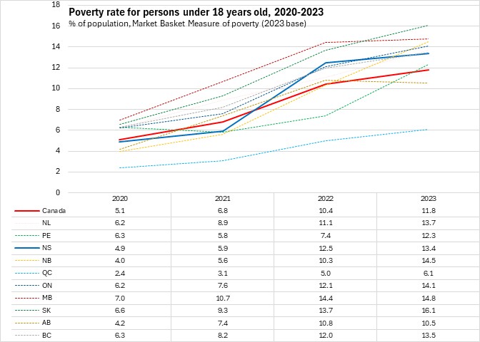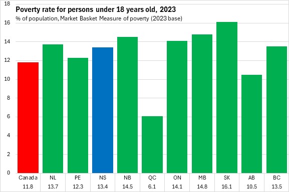 The child poverty rate in Nova Scotia was 13.4% in 2023 (using the 2023 base for the market basket). The national child poverty rate was 11.8% with the highest child poverty in Saskatchewan and the lowest child poverty in Québec.