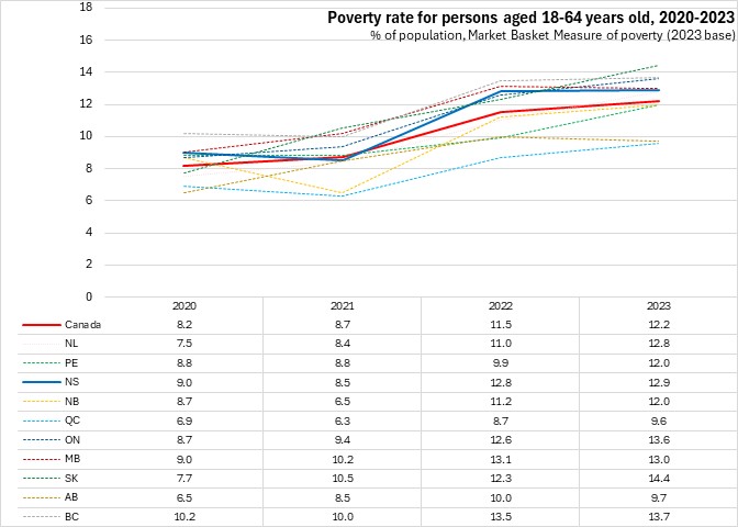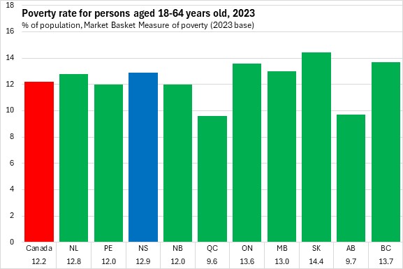 The poverty rate for those aged 18-64 was 12.9% in Nova Scotia (using the 2023 base for the market basket). The poverty rates for those aged 18-64 was 12.2% nationally with the lowest rates in Alberta and Québec and the highest rate in Saskatchewan.