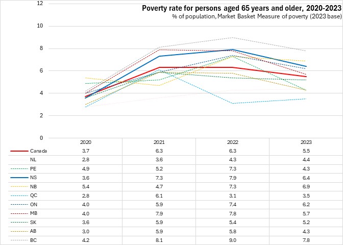 Nova Scotia's poverty rate among seniors was 6.4% - the third highest rate among the provinces for this cohort after British Columbia and New Brunswick. The national seniors poverty rate was 5.5% with the lowest value in Québec.