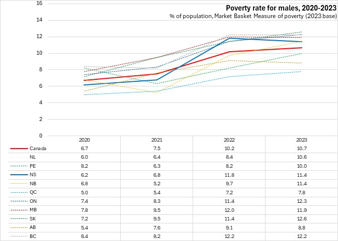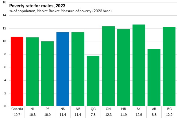 The male poverty rate was 11.4% in Nova Scotia in 2023 (2023 base for the market basket). The male poverty rate was 10.7% nationally with the lowest poverty rate in Québec and the highest rates in Ontario and Saskatchewan.