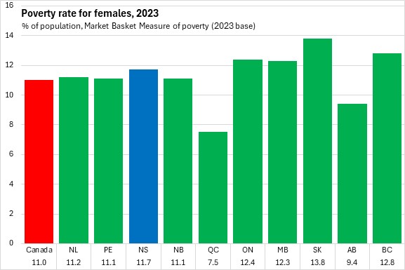 The female poverty rate was 11.7% in Nova Scotia in 2023 (2023 base for the market basket). The national female poverty rate was 11.0% in 2023, with the the lowest female poverty rate in Québec and the highest in Saskatchewan.