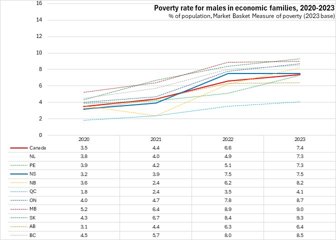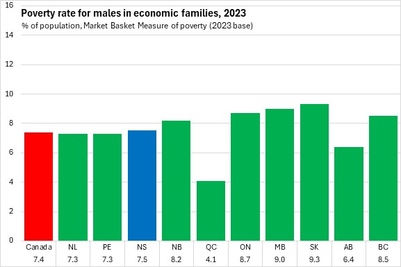 The poverty rate among Nova Scotia males in economic families was 7.5% in 2023 (2023 base for the market basket). Nationally, males in economic families had a poverty rate of 7.4% with the lowest prevalence in Québec and the highest in Saskatchewan.