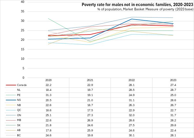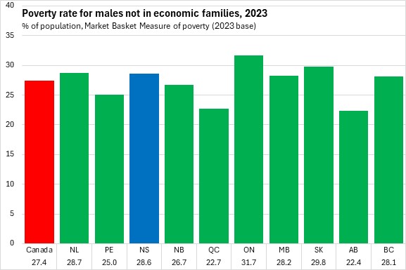 Nova Scotia's poverty rate for males not in an economic family was substantially higher than for males in an economic family at 28.6% in 2023 (2023 base for the market basket). Ontario reported the highest poverty rate for this cohort. Nationally, the poverty rate among males not in an economic family was 27.4% with the lowest poverty rates in Alberta and Québec.
