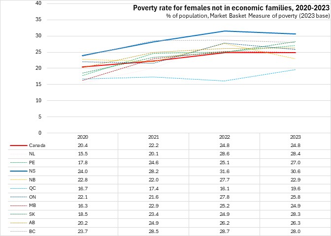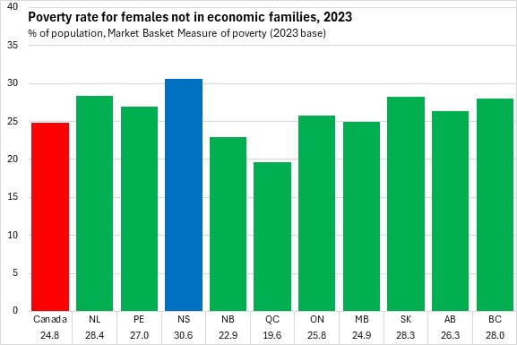 Nova Scotia's poverty rate for females not in an economic family was 30.6% in 2023 - the highest among provinces and substantially higher than for females in an economic family. Nationally, females not in an economic family had a poverty rate of 24.8% with the lowest value in Québec.