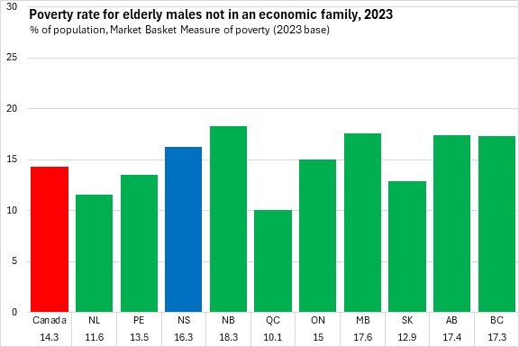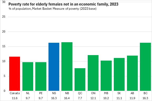 Nova Scotia's poverty rate for elderly females not in an economic family was the same as for elderly males not in an economic family: 16.3%. Poverty rates among elderly persons not in an economic family declined in 2023 in Nova Scotia.