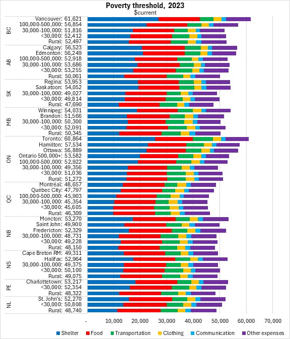 The threshold for the poverty rate varies by province and community size. In Nova Scotia, the income required for a reference family (2 adults, 2 children) to afford a basic standard of living ranged from $49,075 in rural Nova Scotia to $52,964 in Halifax. The highest thresholds were reported in larger cities: Vancouver, Calgary, Edmonton, Toronto and Ottawa. The lowest thresholds were in smaller communities of Québec.