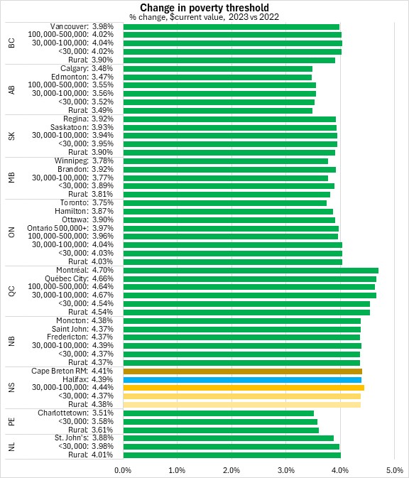 Compared with the 2023 base thresholds from 2022, Nova Scotia's Market Basket Measure threholds increased by between 4.37% and 4.44%. MBM threshold levels grew faster in the Québec, New Brunswick and Nova Scotia.