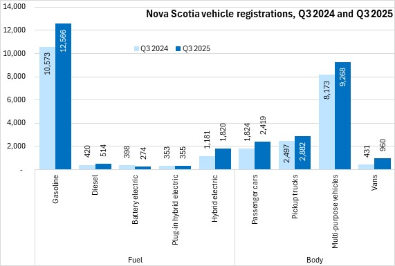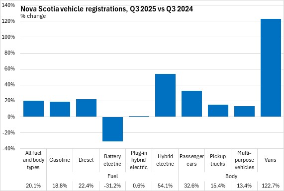 Registrations were up the most for hybrid-fuelled vehicles (+54.1%) in Q3 2025 while battery electric (-31.2%) reported lower registrations than in Q3 2024. Among body types, registrations were up most for vans (+122.7% - though this started from a relatively low value). Registrations were up for all other body types in Nova Scotia from Q3 2024 to Q3 2025.
