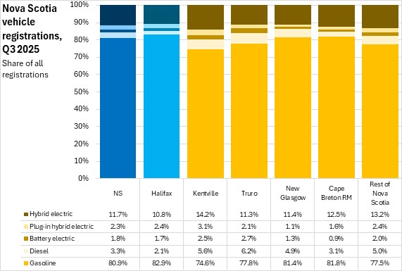 Across Nova Scotia, gasoline-fuelled vehicles were the majority of registrations in all areas in Q3 2025. Gasoline-fuelled vehicle registrations were more prevalent in Halifax, followed by Cape Breton Regional Municipality and New Glasgow. Battery electric vehicles were more commonly registered in Truro and Kentville while hybrid electric were more commonly registered in Kentville. Diesel-fuelled vehicles were more commonly-registered in Truro.