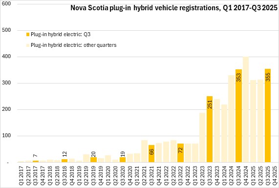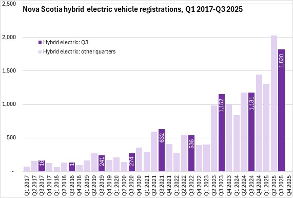Hybrid electric vehicle registrations have risen sharply in the last two years - making them the second most common type vehicle propulsion registered in Nova Scotia in Q3 2025.