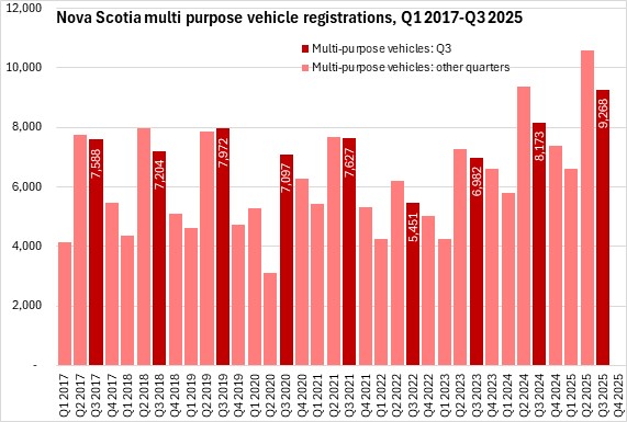 Multi-purpose vehicles such as sport-utility vehicles remain by far the most commonly-registered new vehicles in Nova Scotia, particularly in the last year.