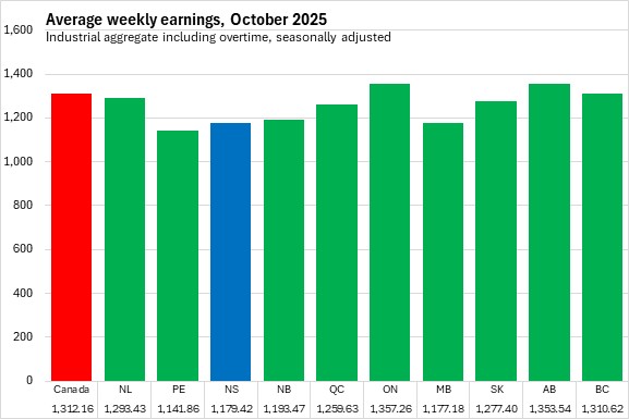 Nova Scotia's average weekly earnings in October 2025 were third lowest among provinces, ahead of Prince Edward Island and Manitoba. Ontario and Alberta reported the highest average weekly earnings.