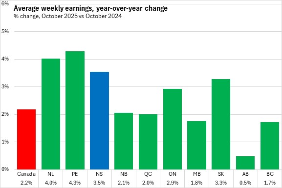 Average weekly wages grew by 3.5% in Nova Scotia from October 2024 to October 2025. This was stronger than the national pace of 2.2%.