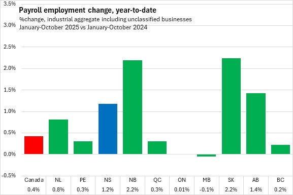 In the first ten months of 2025, Nova Scotia's payroll employment increased 1.2%. This was faster than the national average of 0.4% as all provinces reported growth except Manitoba. The fastest year-to-date growth was reported in New Brunswick and Saskatchewan