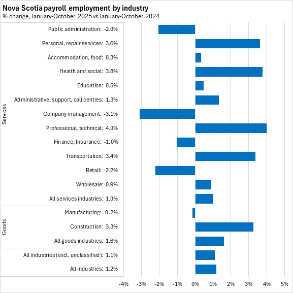 Professional/technical, health care/social assistance, and personal/repair services reported the fastest growth in payroll employment in the first ten months of 2025 in Nova Scotia. The fastest declines were reported in company management and retail trade.