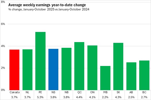 In January-October 2025, average weekly earnings grew 3.8% in Nova Scotia compared to the same period last year. National average weekly earnings grew 3.7% with all provinces reporting growth over this period. Prince Edward Island reported the fastest growth while Manitoba reported the slowest.