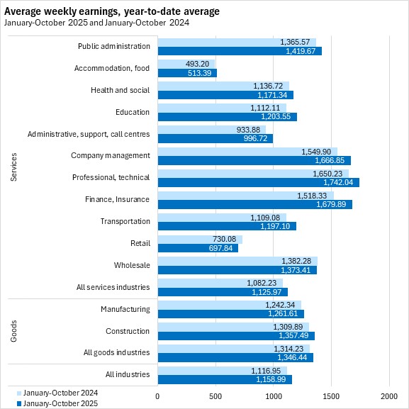 Nova Scotians' average weekly earnings were $1,179.42 in October 2025, a decline of $5.60 (-0.47%) from September 2025.